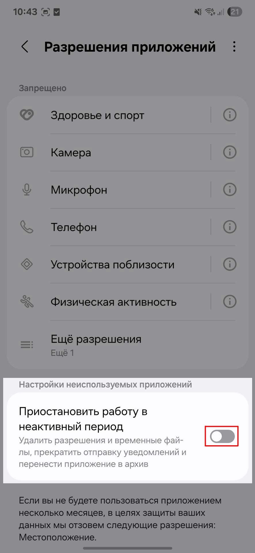 - Проматываем в самый низ и находим ‘Настройки неиспользуемых приложений > Приостановить работу в неактивный период’ и меняем положение переключателя на ‘Выключено’